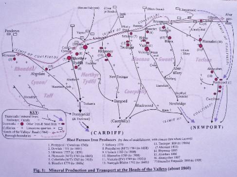 1. Pre-industrial base – V. poor semi-subsistent upland livestock farming > sparse hamlet and farm pattern; transport at speed of horses and carts along tracks and poorly maintained roads. Isolated: local markets at Brynmawr and Tredegar, and down valley at Abercarn. Some small forges and furnaces produced wrought and cast iron for local use – mainly tools for farmers, farriers, hauliers etc.